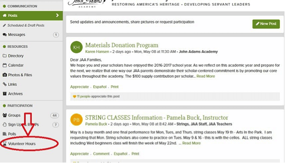You can also log hours or donations by clicking the Volunteer Hours button in the lower-left corner of the navigation bar from any ParentSquare screen.