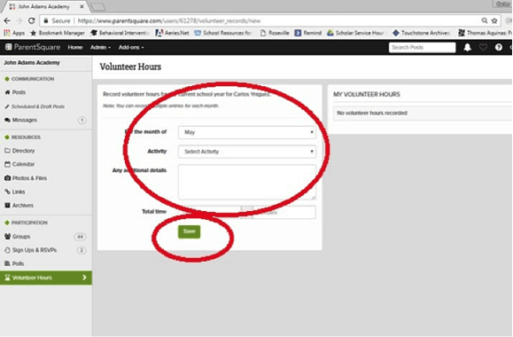 In the Volunteer Hours screen, report your volunteer information and click "Save".